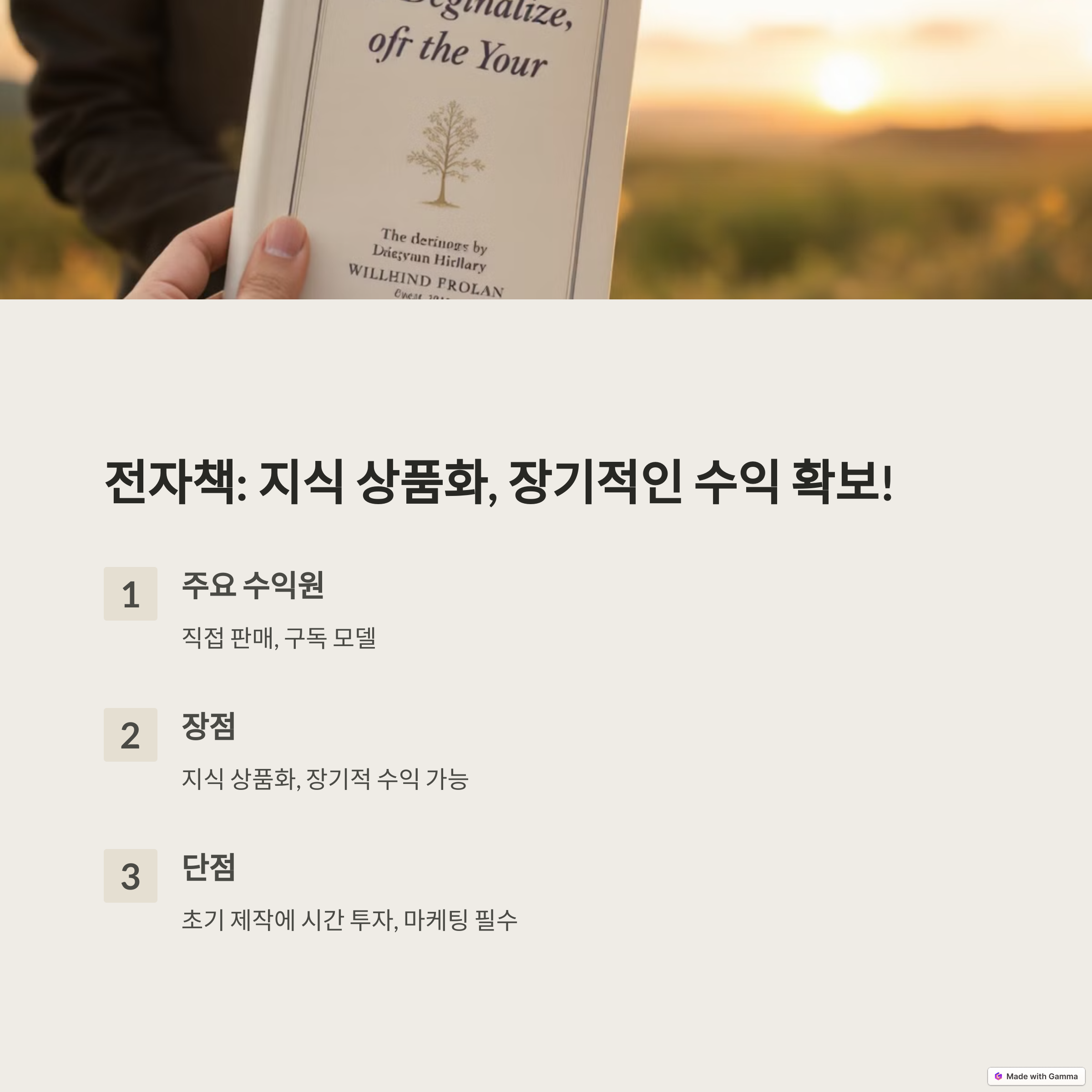 전자책은 한 번 제작하면 지속적인 패시브 인컴을 만들 수 있는 매우 효율적인 방법입니다. 블로그나 유튜브와 병행하여 판매하면 더욱 효과적이며, 아마존 KDP, PDF 판매, 유료 강의 등의 방식으로 수익을 창출할 수 있습니다. 하지만 초기 콘텐츠 제작이 어렵고, 판매 채널을 구축해야 한다는 단점이 있습니다.