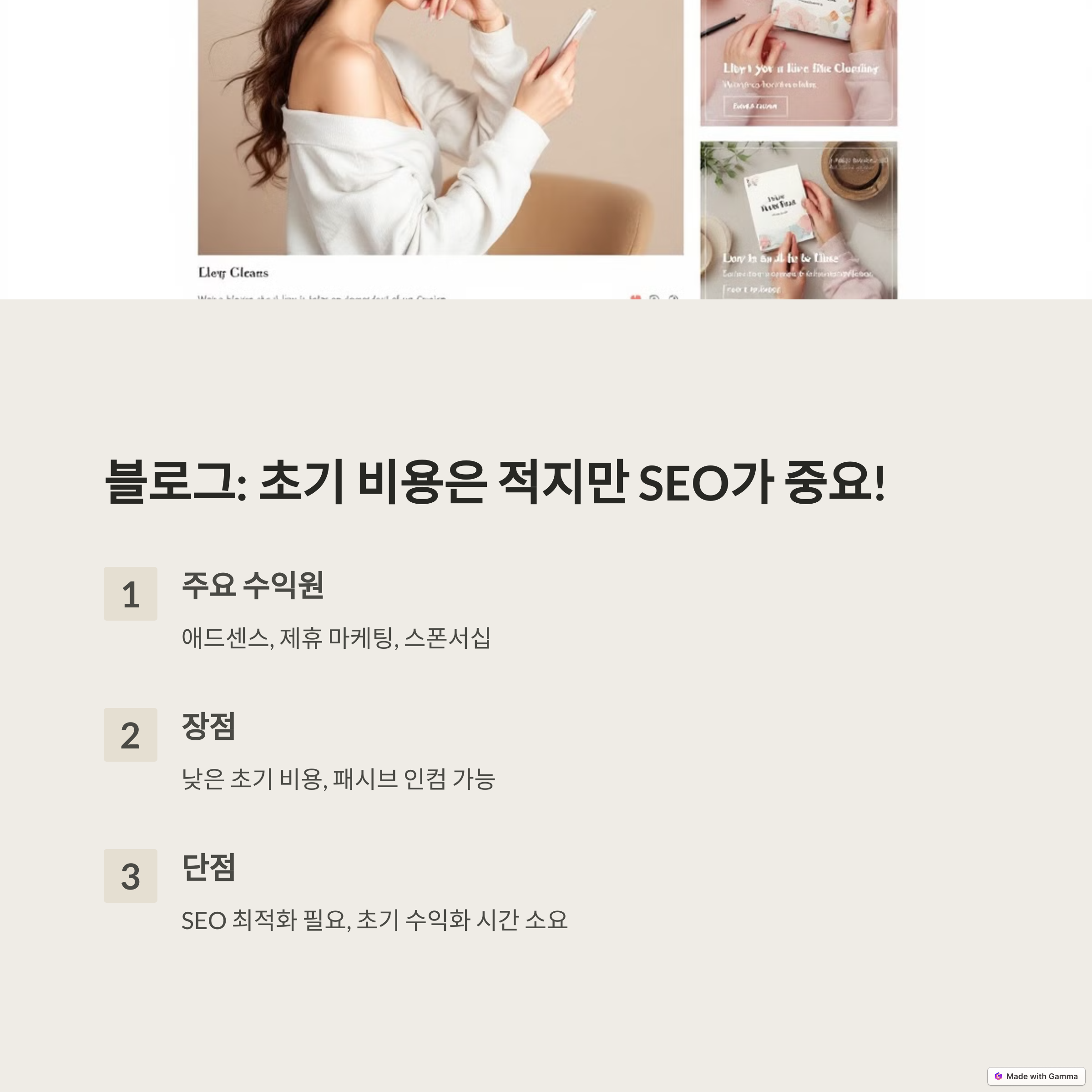 | 검색 상위 노출 시 장기간 트래픽 확보 가능 | 바이럴 시 빠른 구독자 증가 가능 | 지속적인 패시브 인컴 가능 |