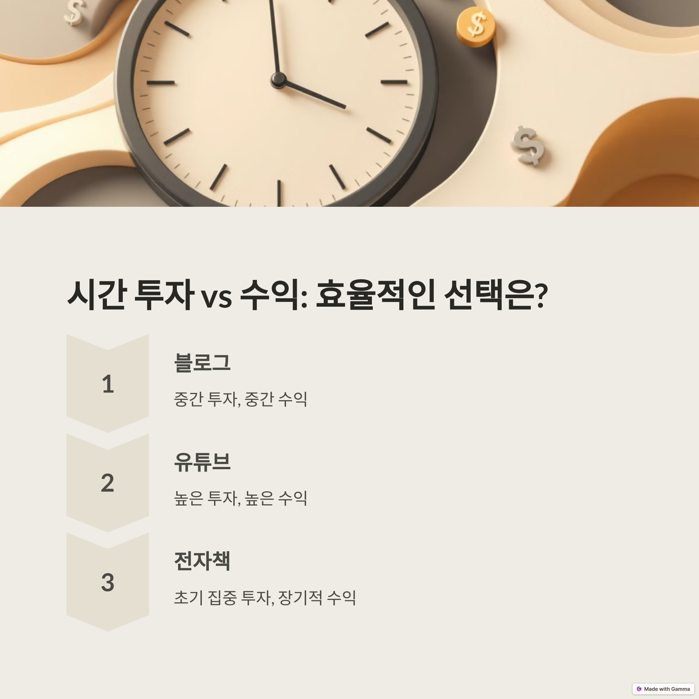 블로그, 유튜브, 전자책 중 어떤 것이 나에게 적합할지 고민된다면, 먼저 하나를 선택해 작은 실험을 해보는 것도 좋은 방법입니다. 시간과 투자 비용을 고려해 현실적인 목표를 설정하세요. 하나의 모델을 시작한 후 점진적으로 확장하는 것이 가장 효과적인 전략입니다.