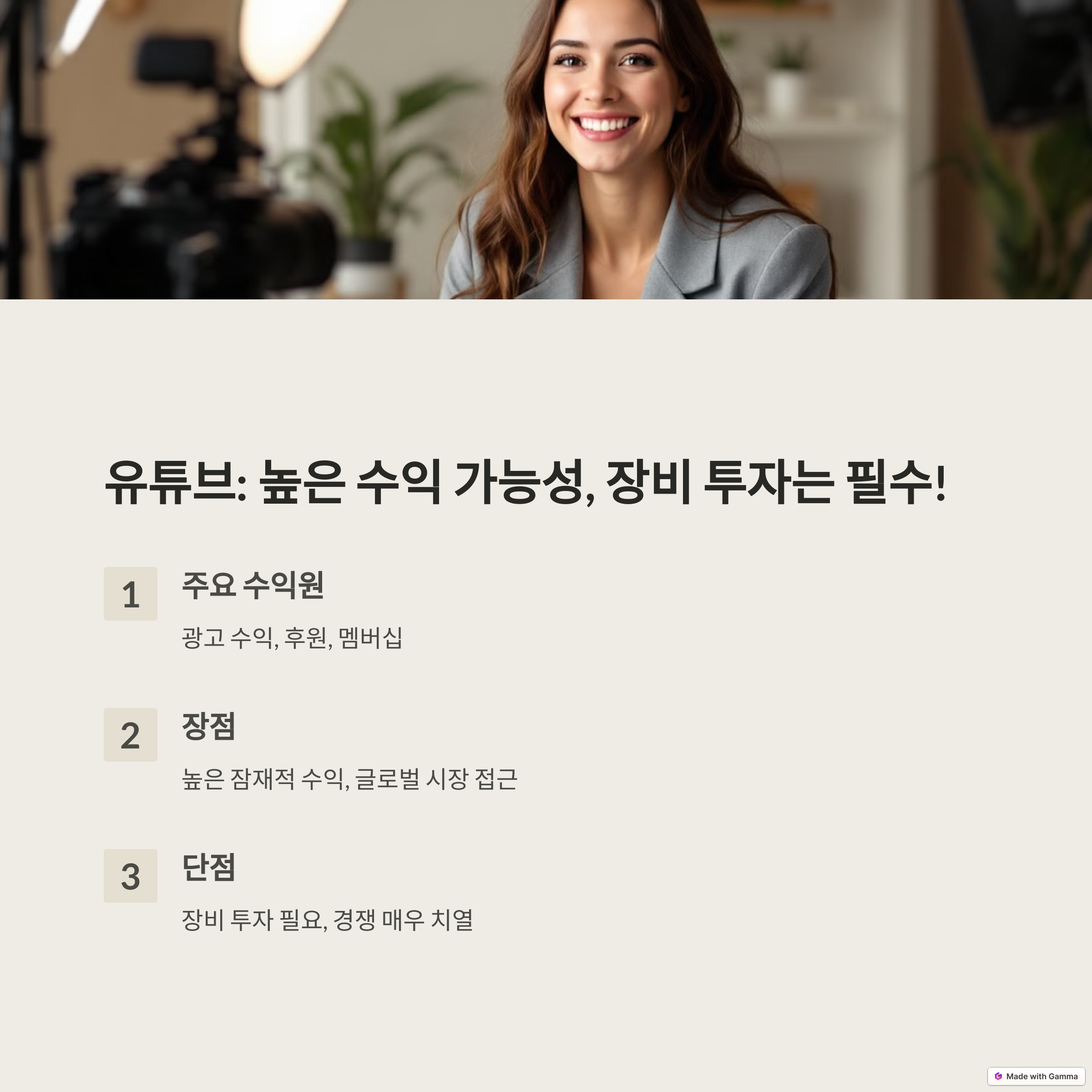유튜브는 영상 콘텐츠를 활용한 수익 모델입니다. 영상은 전파력이 강해 구독자 확보가 빠를 수 있으며, 하나의 영상이 바이럴되면 단기간에 많은 수익을 창출할 수도 있습니다. 하지만 영상 제작에는 많은 시간과 편집 기술이 필요하며, 촬영 장비나 편집 소프트웨어 구매 등 초기 투자 비용이 발생할 수 있습니다.