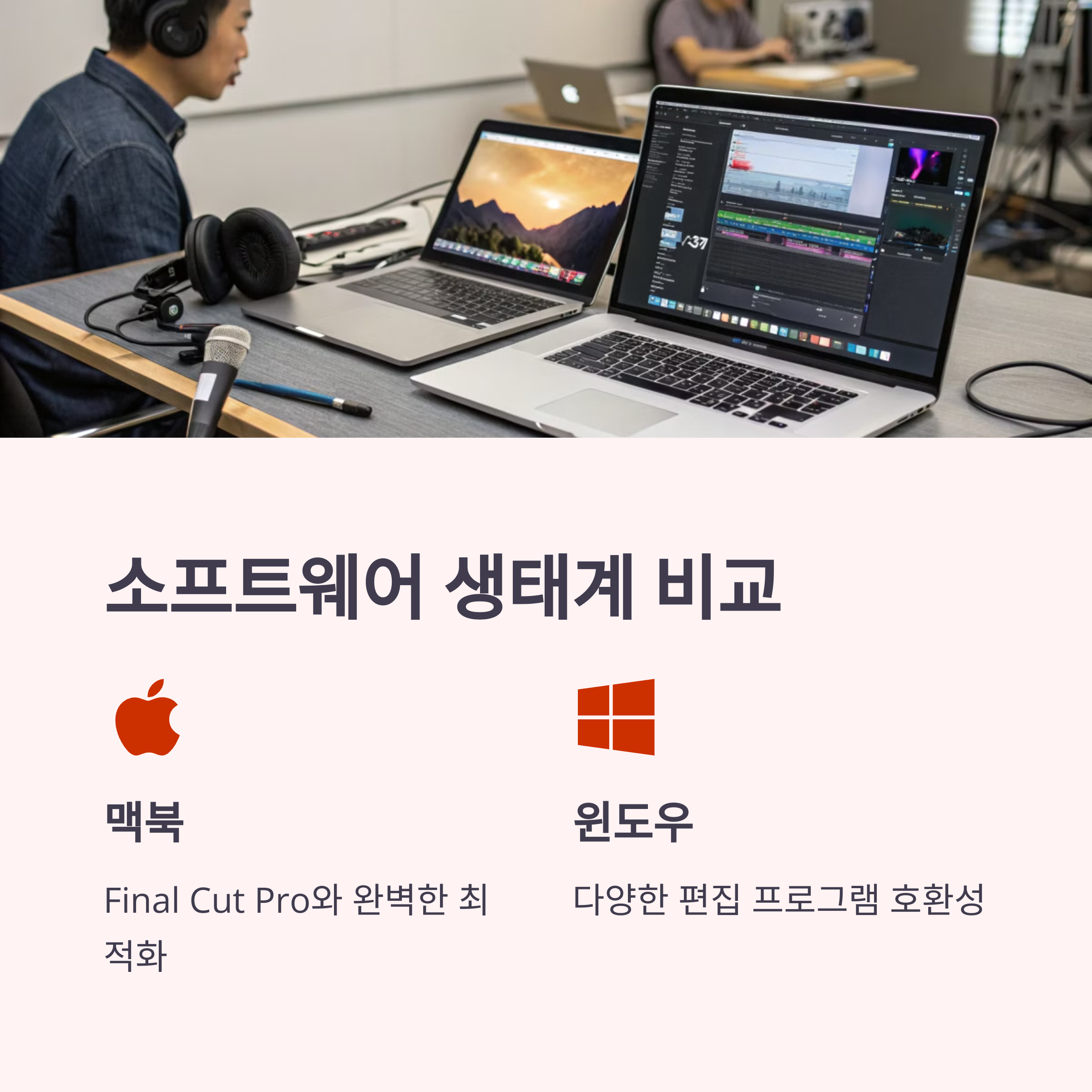 | 소프트웨어 호환성 | 맥북은 Final Cut Pro 최적화, 윈도우는 Adobe Premiere Pro 강점 |