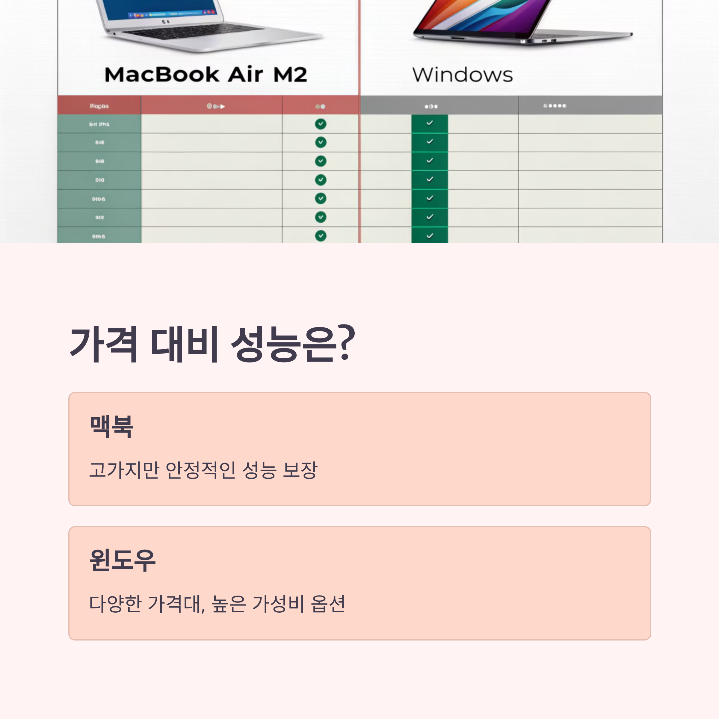 맥북은 운영체제 최적화로 안정적인 성능을 제공합니다. 하지만 가격이 상대적으로 높아 부담이 될 수 있습니다. 반면, 윈도우 노트북은 다양한 가격대의 제품이 출시되며, 동일한 가격대에서 더 높은 사양을 선택할 수 있는 장점이 있습니다.