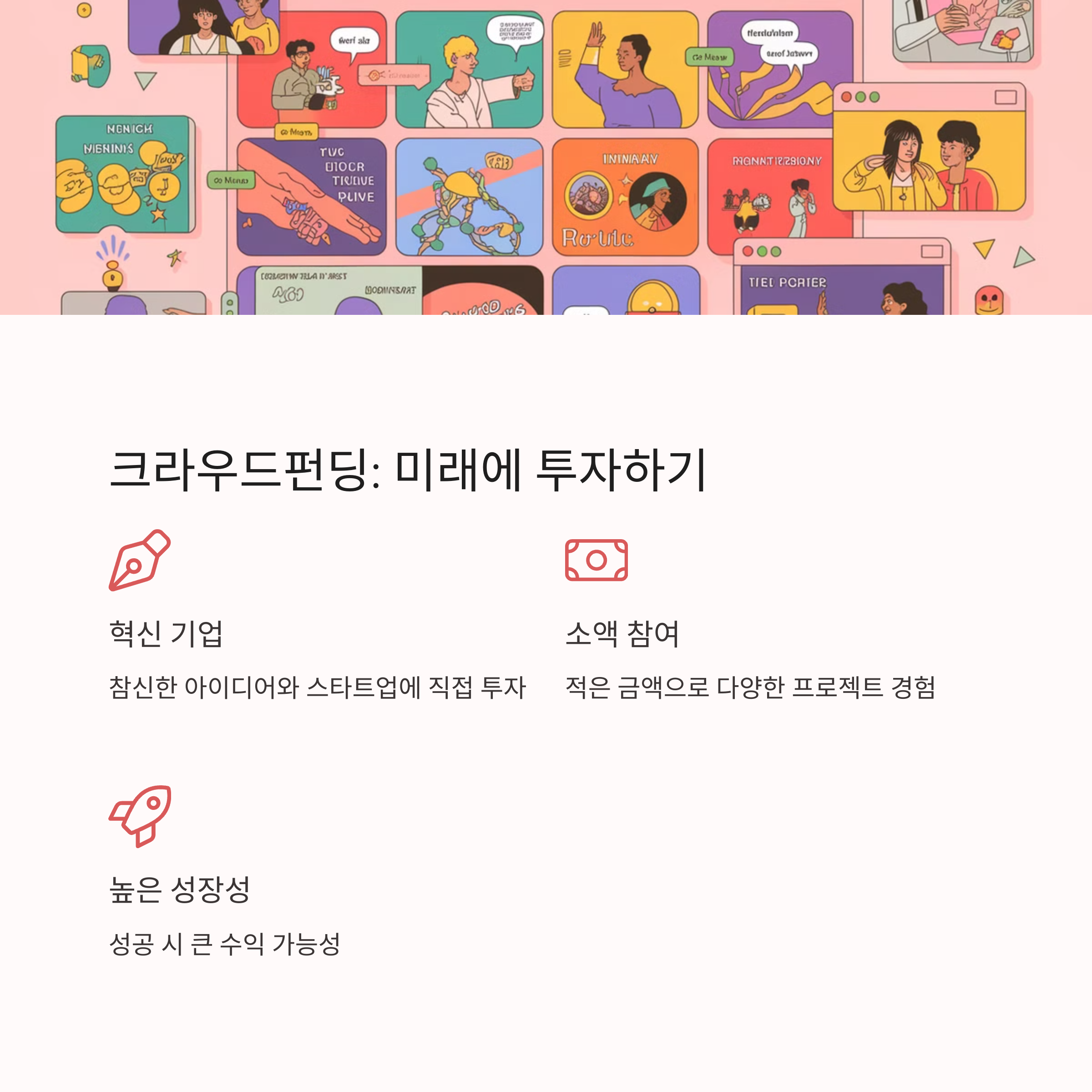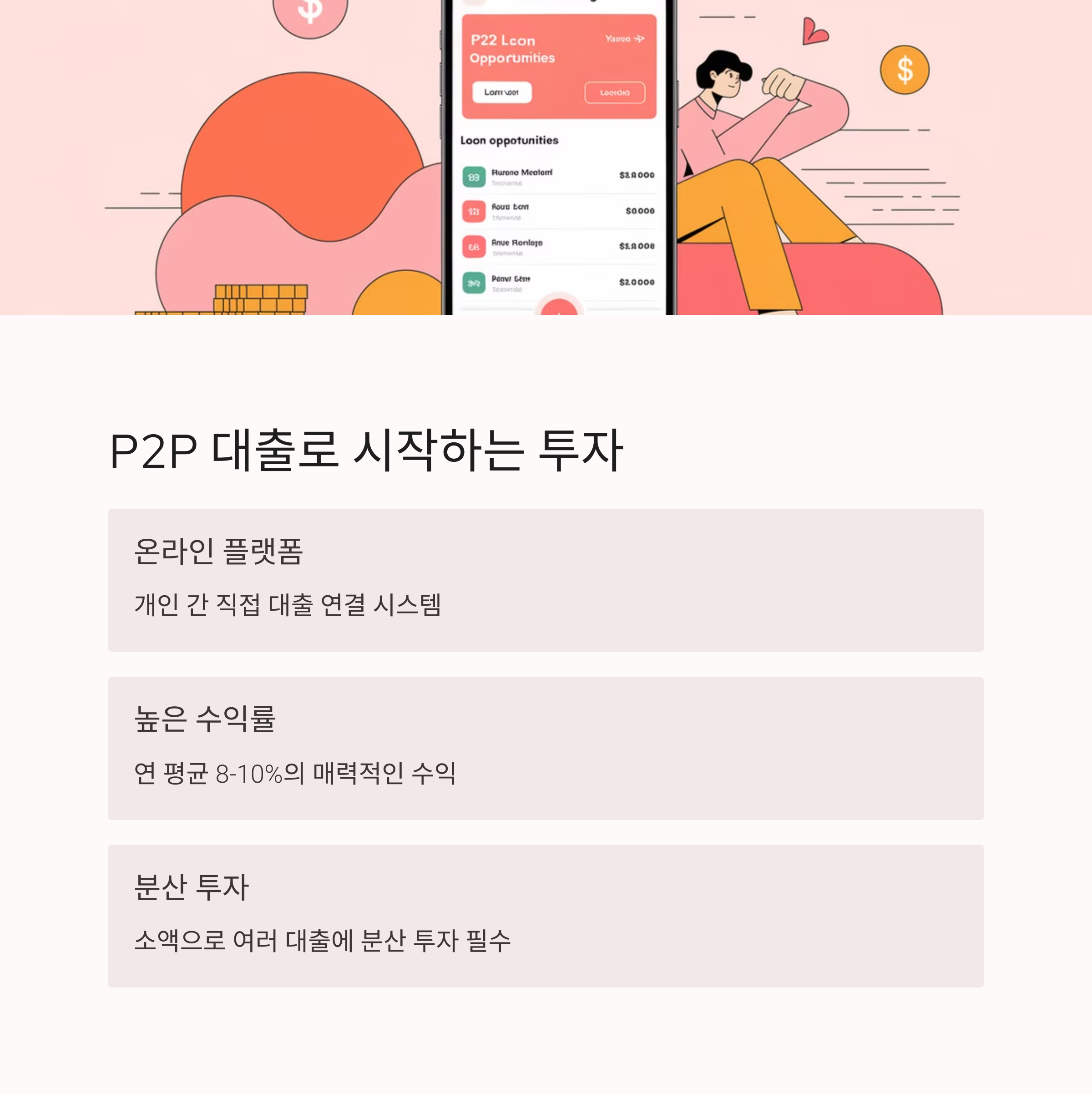 | 예술 작품, 희귀 수집품 | 개인 간 대출, 중금리 상품 | 태양광, 스마트팜 투자 |