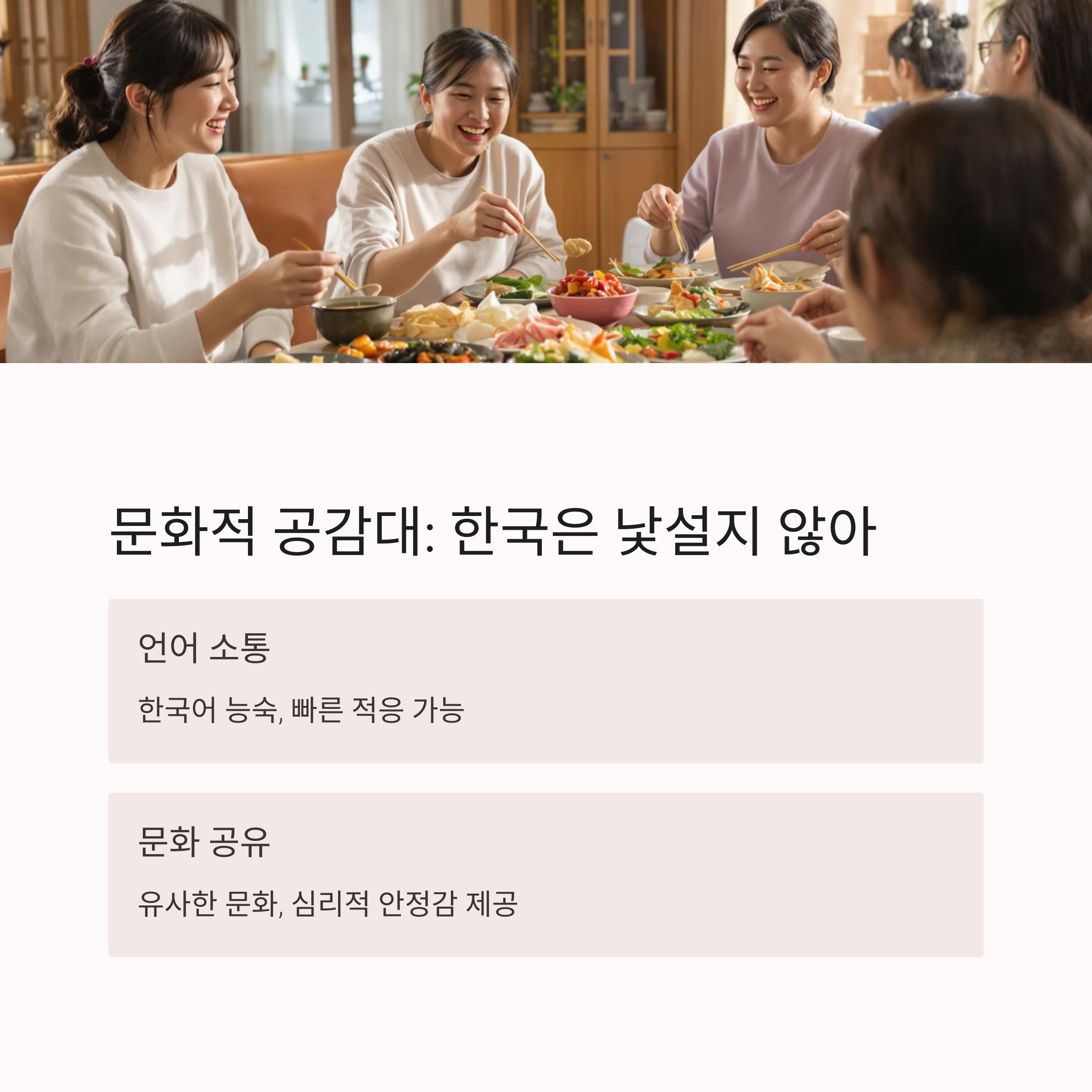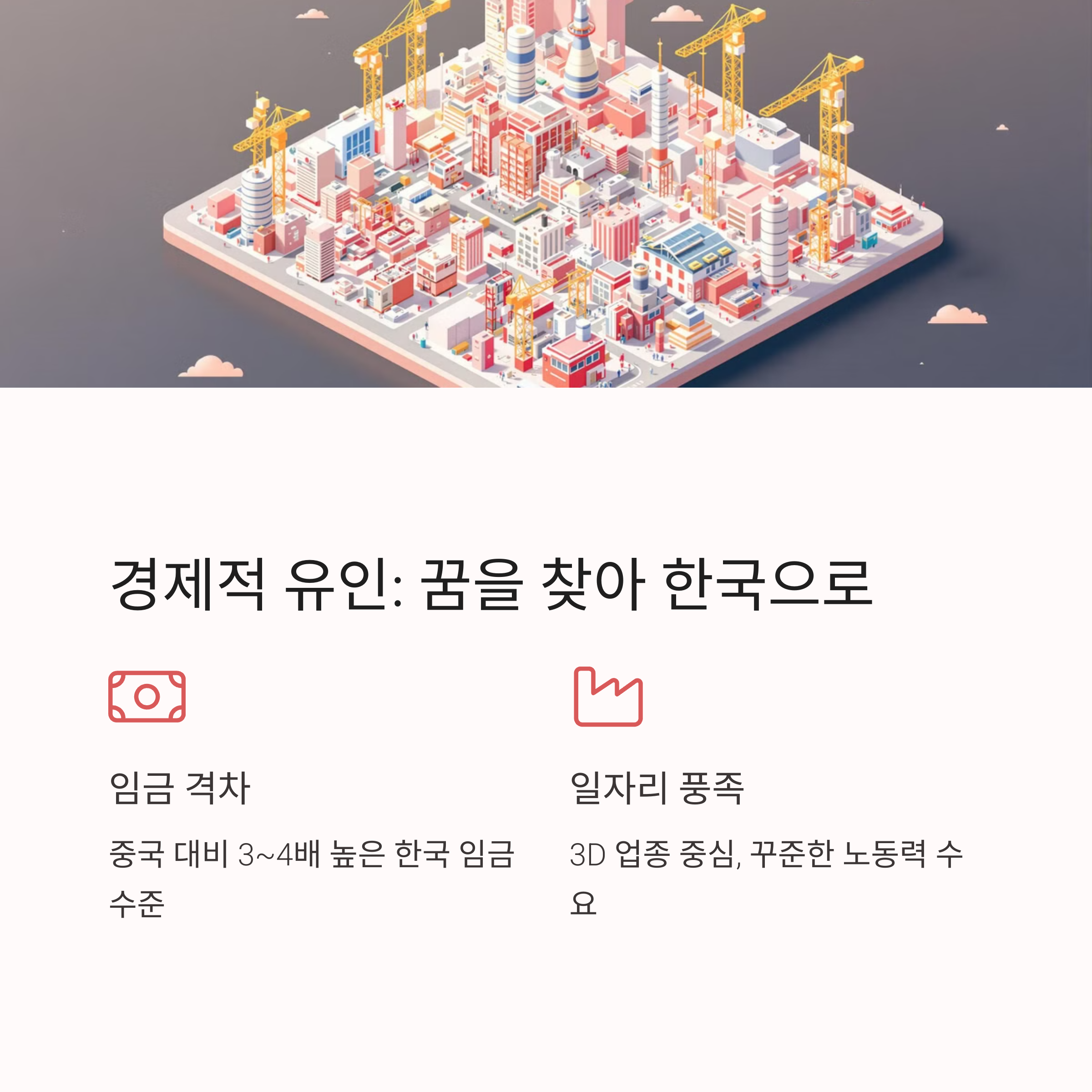 | 높은 임금과 취업 기회 | 한국어 능숙, 적응력 높음 | 가족 및 친척의 지원 |