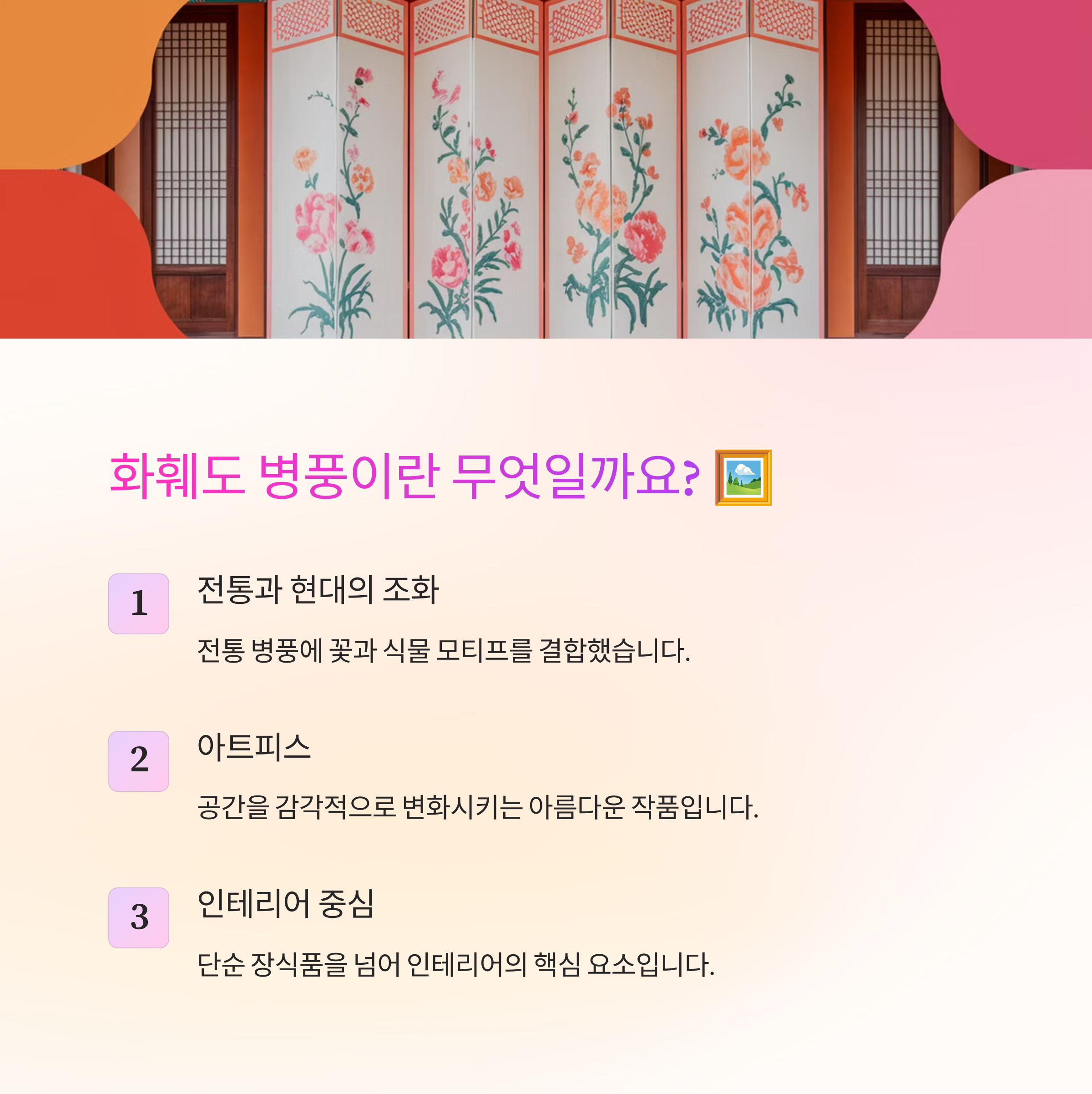 | 화훼도 병풍이란? | 전통 병풍에 꽃과 식물을 결합한 새로운 인테리어 아이템 |