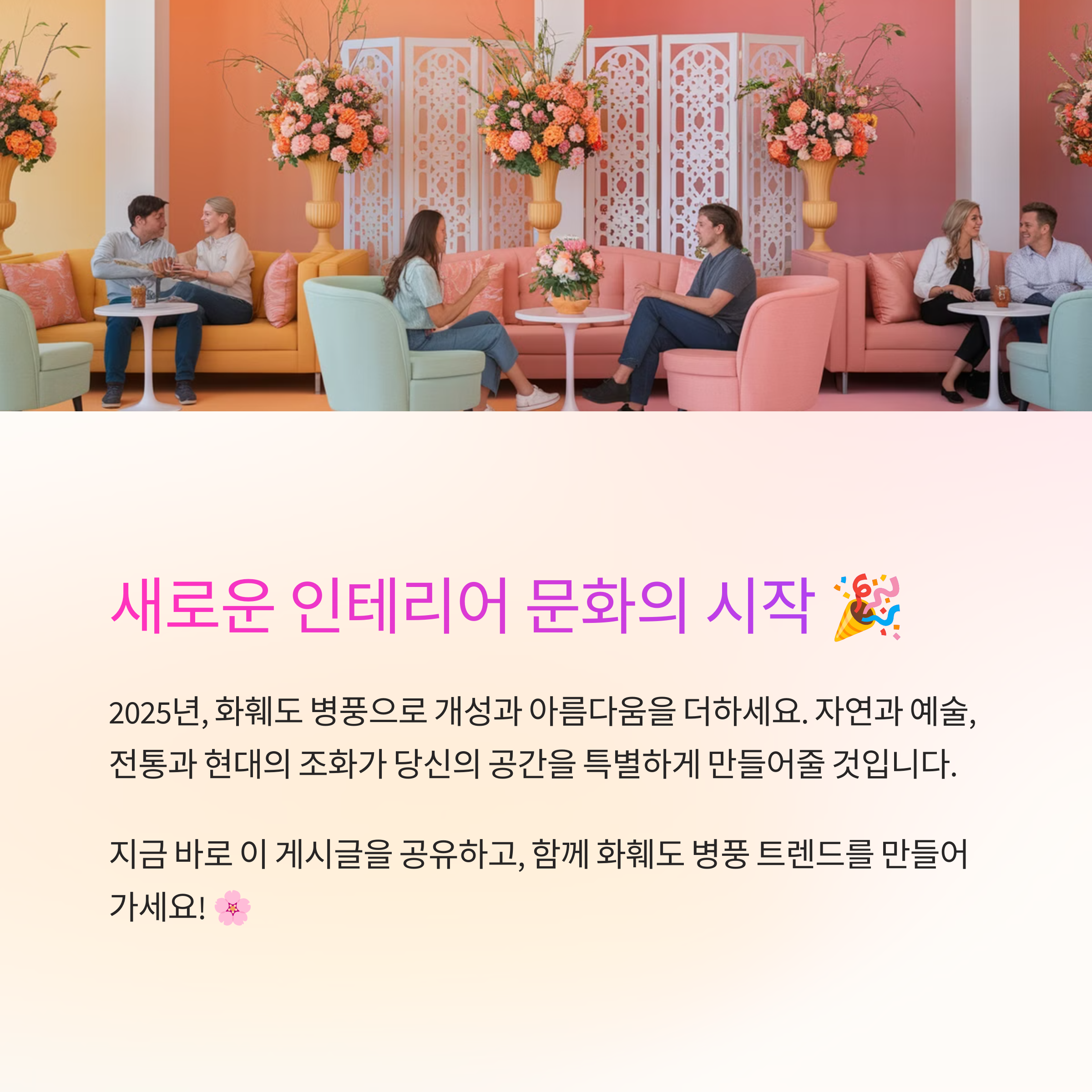 2025년에는 공간 맞춤형 화훼도 병풍이 프리미엄 인테리어 요소로 자리 잡을 가능성이 큽니다. 자연을 실내로 들여오는 트렌드와 전통적인 아름다움을 현대적으로 재해석한 디자인이 결합되면서, 다양한 소비층에서 관심이 더욱 높아질 전망입니다.