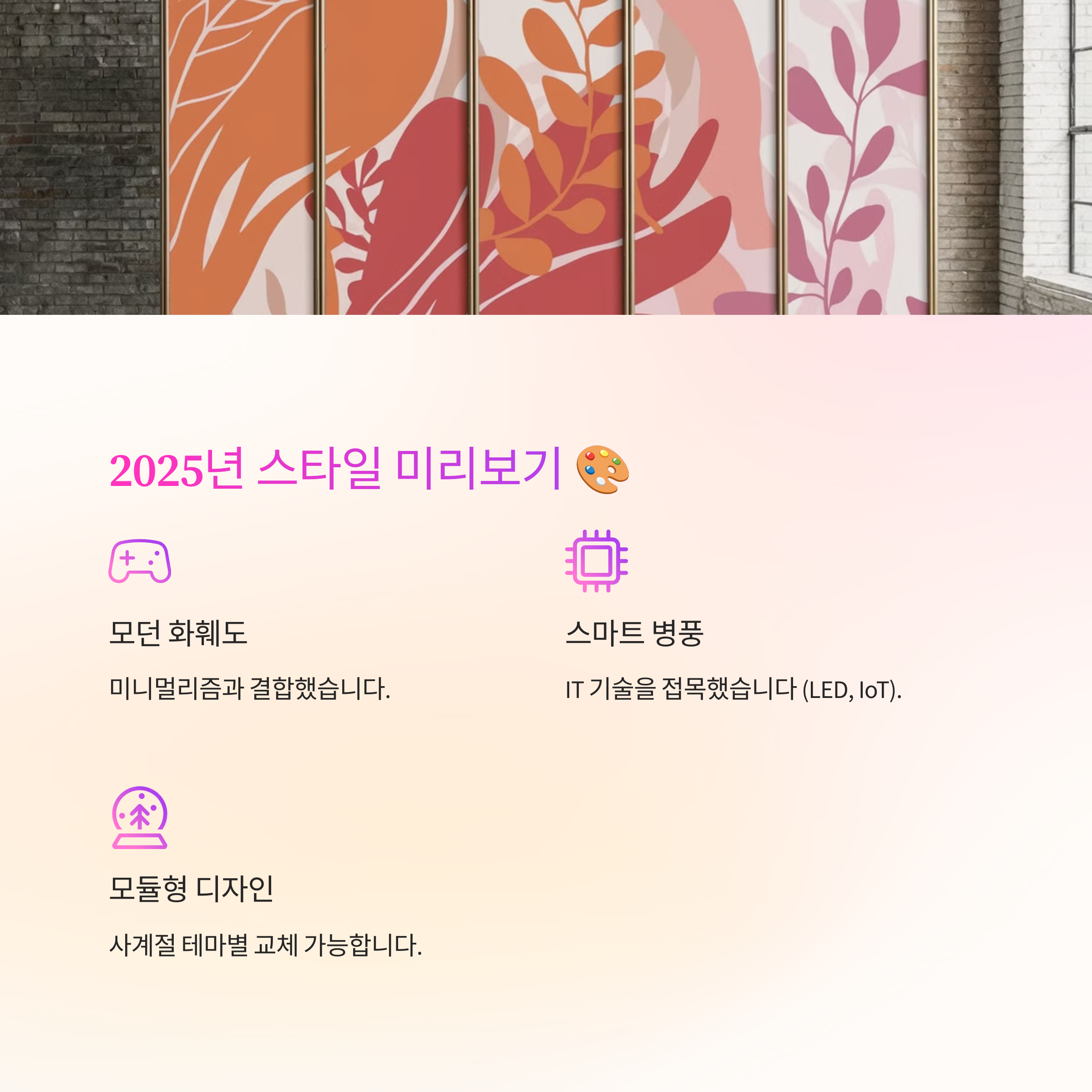 2025년에는 친환경 소재와 디지털 요소가 결합된 화훼도 병풍이 인기를 끌 것으로 예상됩니다. LED 조명이 내장된 병풍, 스마트 화훼 관리 시스템 등이 적용된 제품이 등장할 가능성이 있으며, 개인 맞춤형 디자인을 제공하는 브랜드도 증가할 전망입니다.