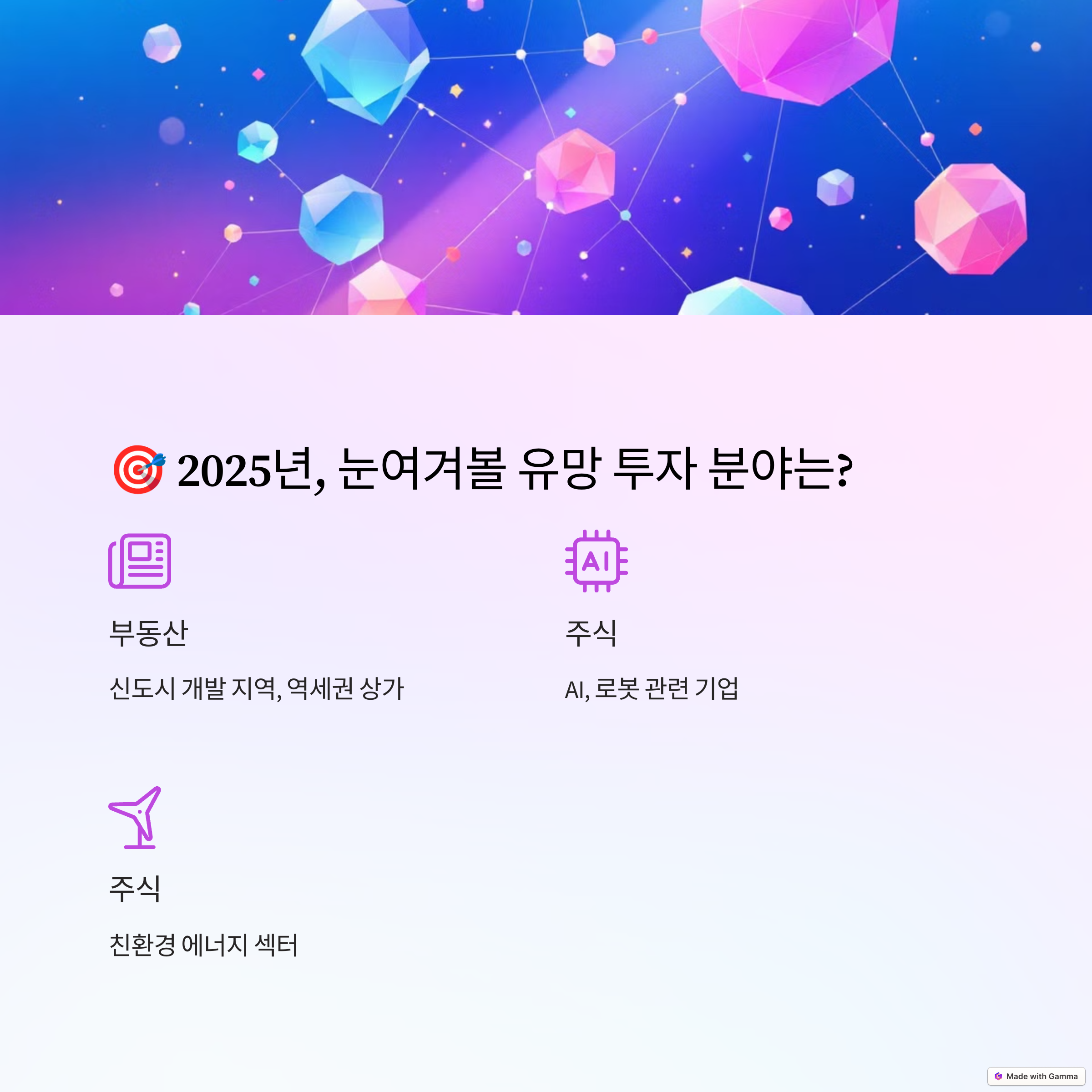 | 유망 투자처 | 대도시 부동산, AI·반도체·헬스케어 관련 주식이 유망합니다. |