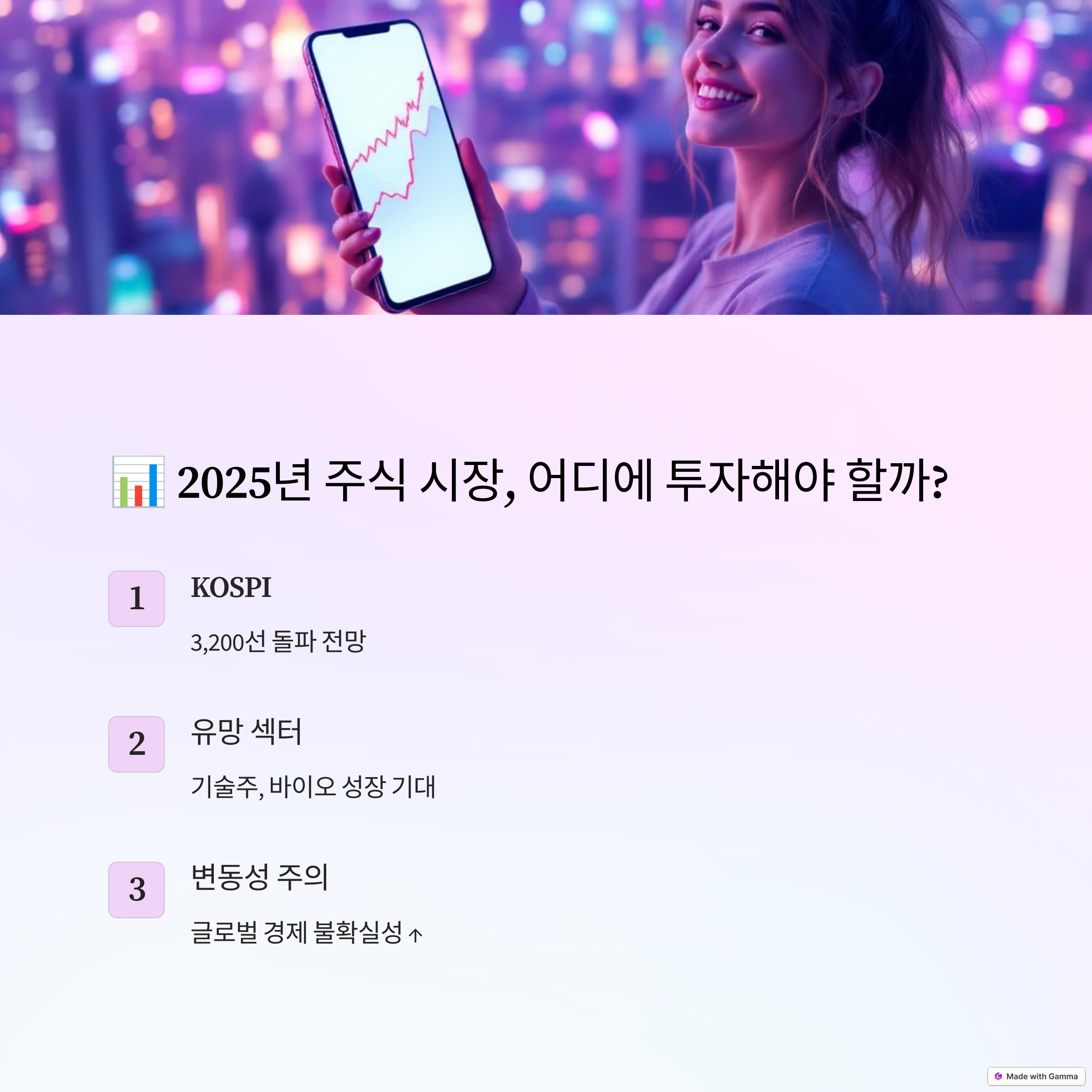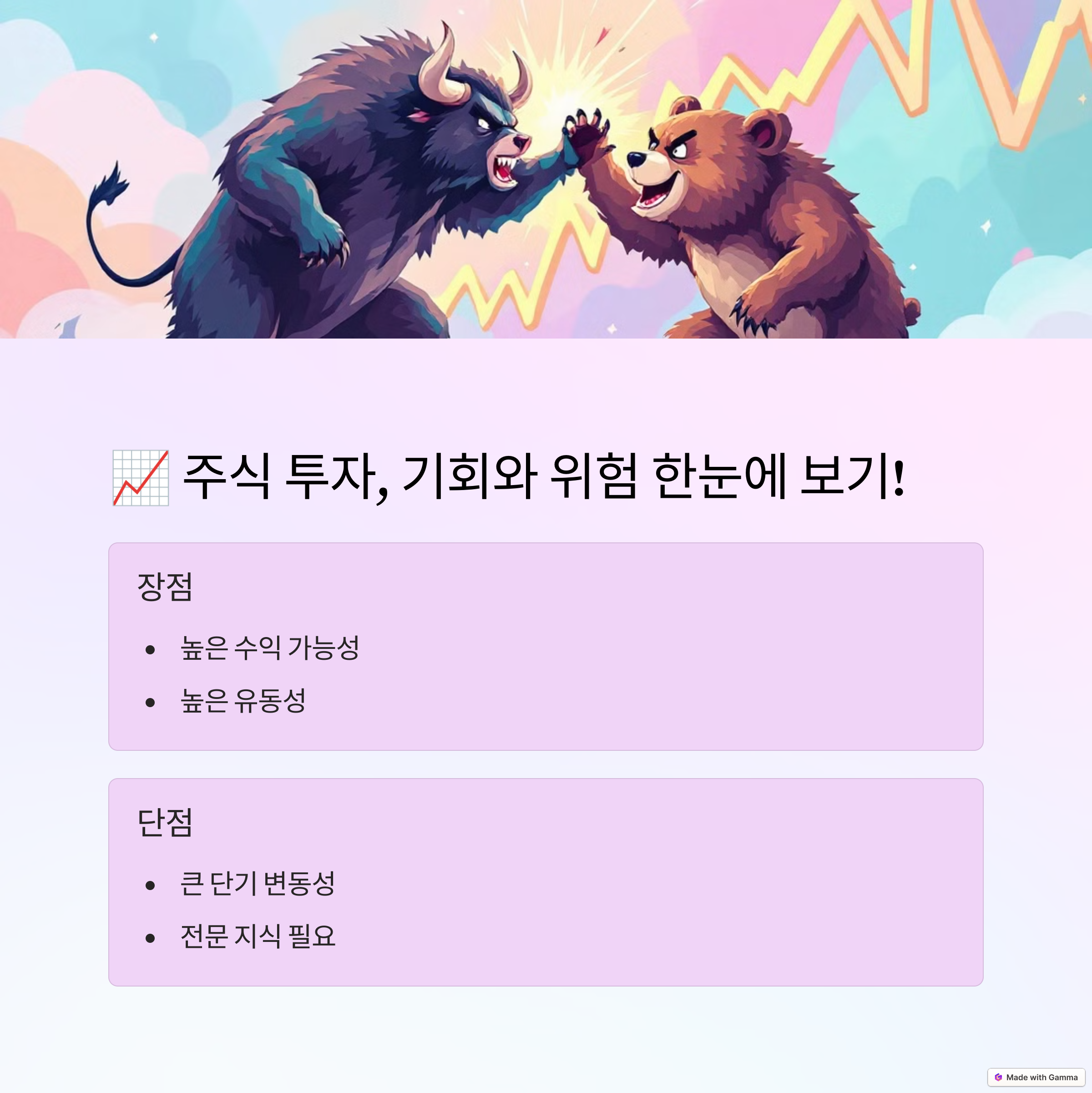 특히 2025년에는 기술주, 친환경 산업, 헬스케어, 인공지능 관련 종목이 유망할 가능성이 큽니다. 하지만 단점으로는 변동성이 크고, 기업 실적이나 글로벌 경제 이슈에 따라 급락할 가능성이 있다는 점을 고려해야 합니다.