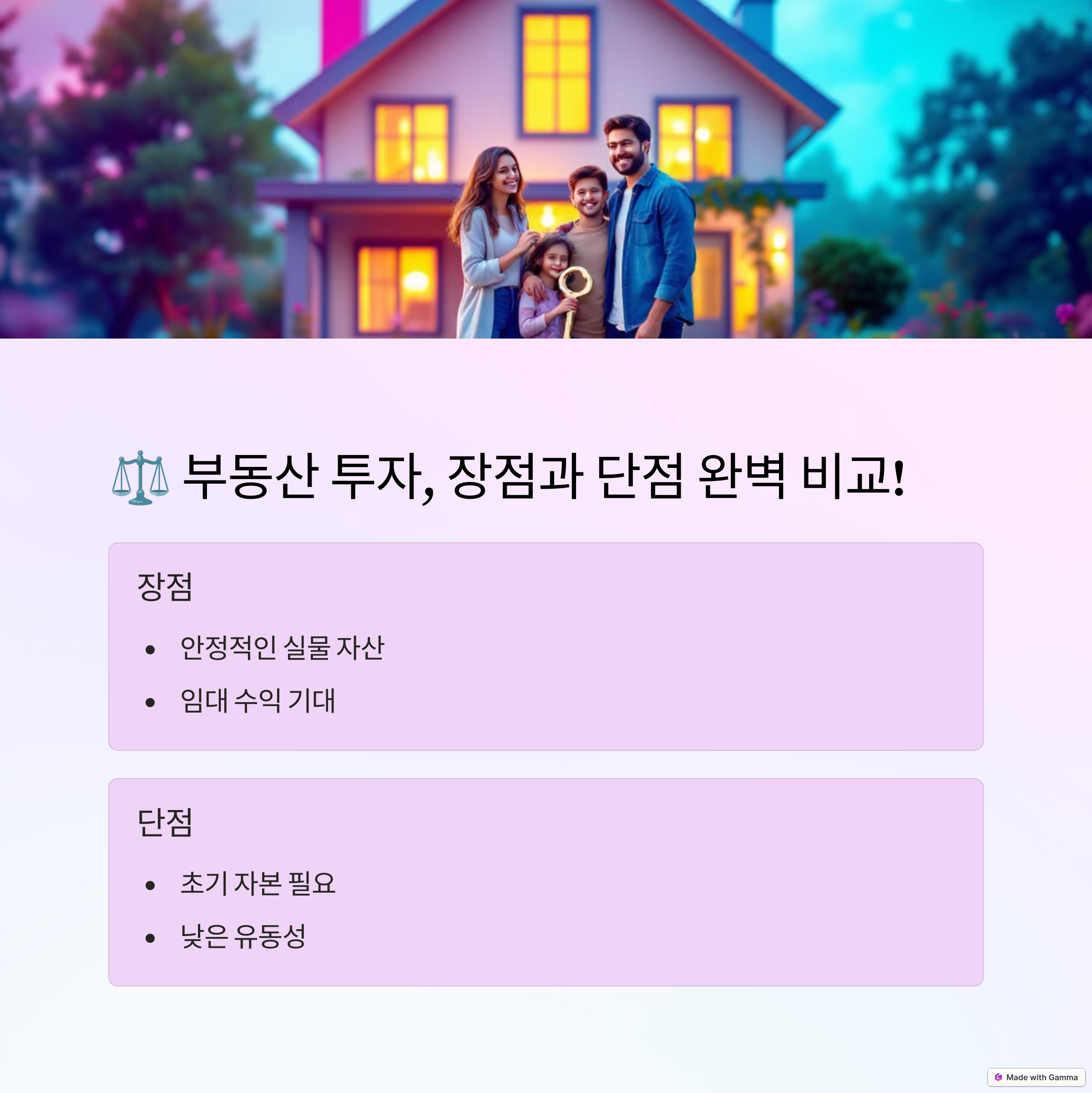 하지만 초기 투자 비용이 크고 유동성이 낮다는 단점이 있으며, 금리 인상 시 대출 부담이 커지고, 정부 규제 정책에 따라 변동성이 커질 수도 있습니다.