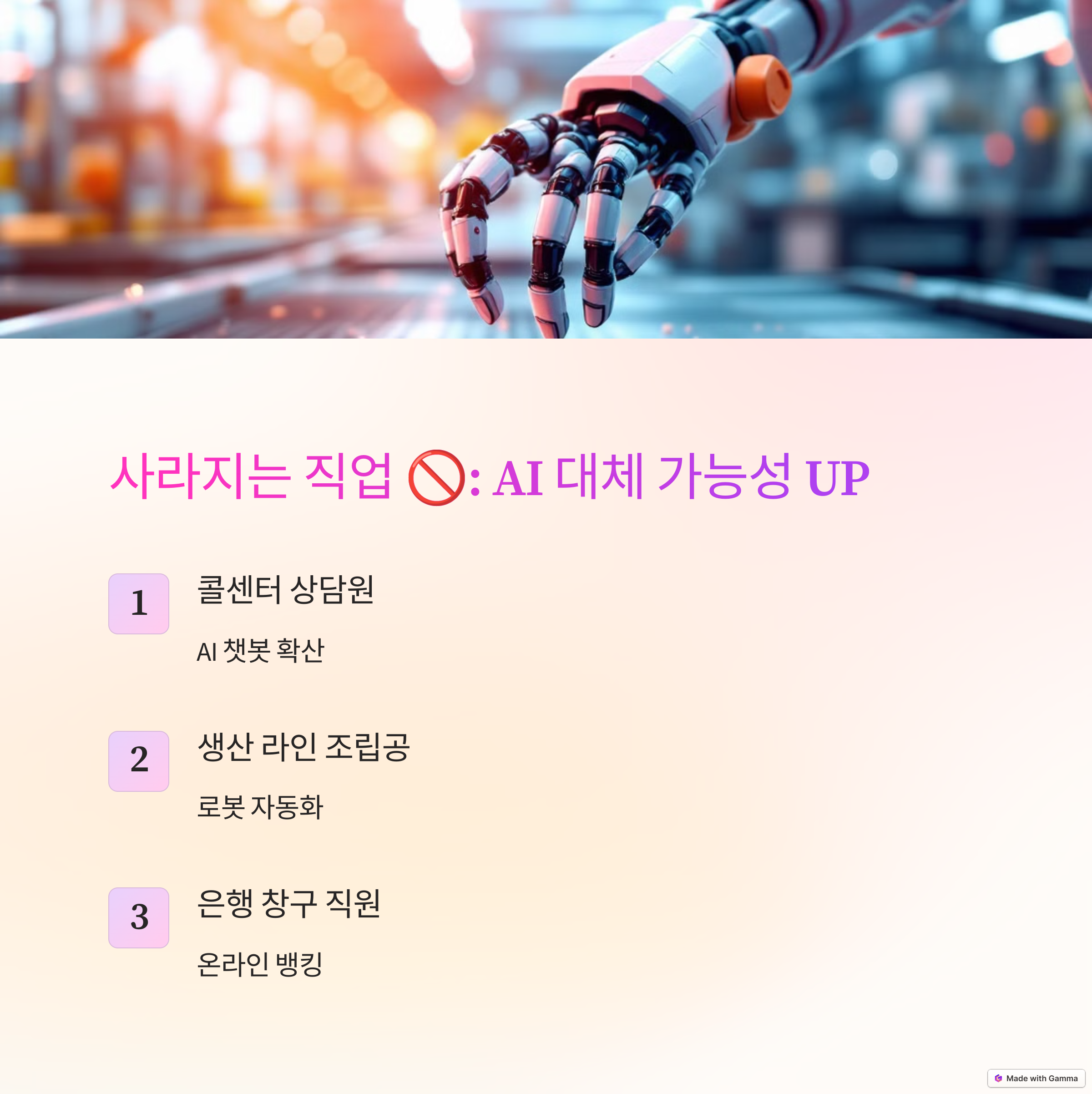 | AI 대체 직업 | 단순 반복 업무는 AI가 빠르게 대체하고 있습니다. |